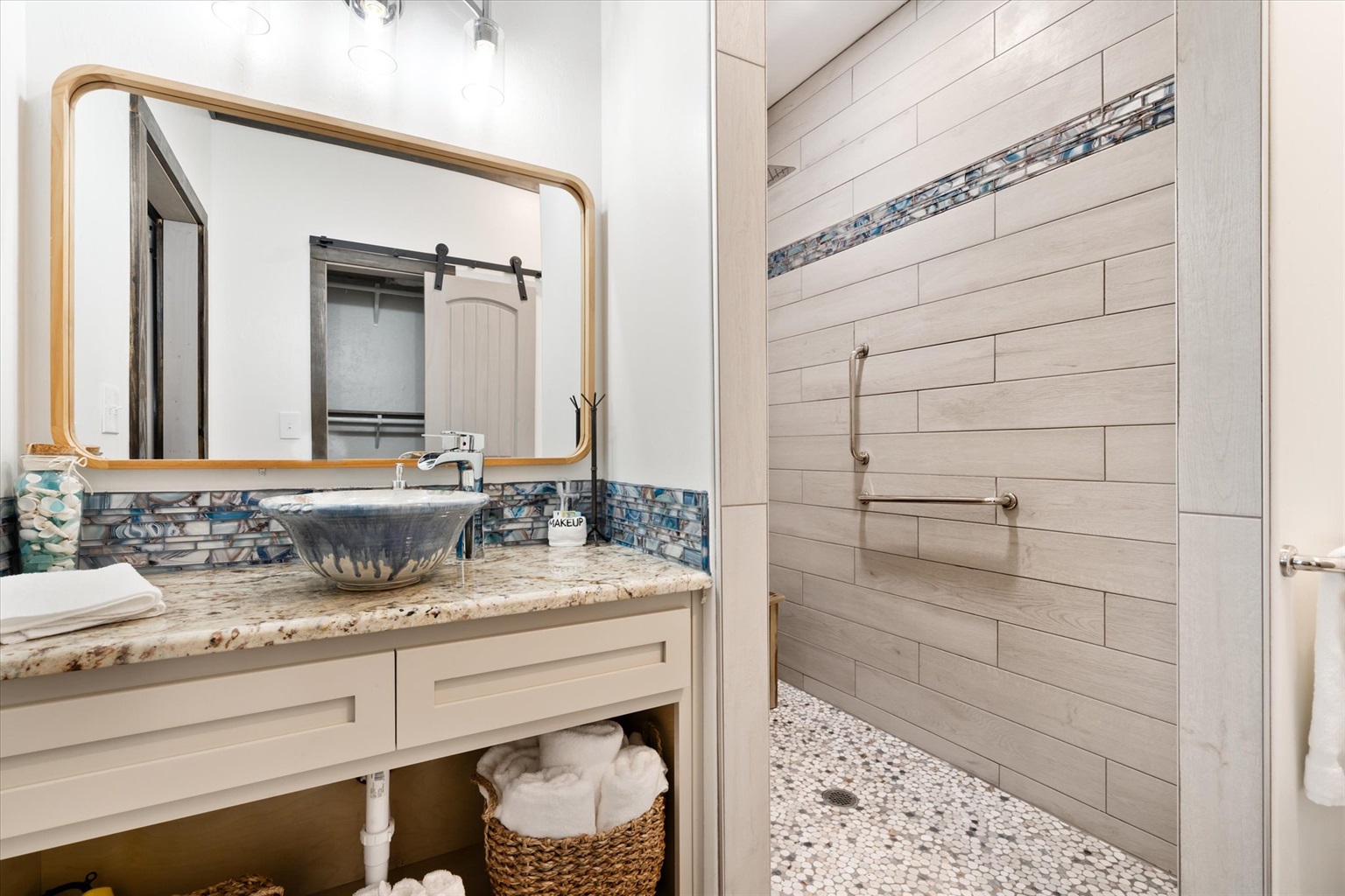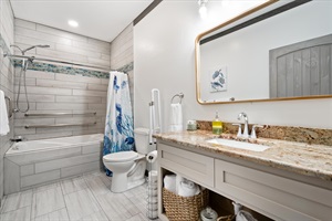Enjoy two master suites with there own private bathrooms with large walkin showers and king beds. Your guest will enjow the guest bedroom with queen bed. The kids will love the bunk room with two sets of bunks. The guest bath is large and handicap freindly with grab bars and also features a soaker tub and tile surround.
