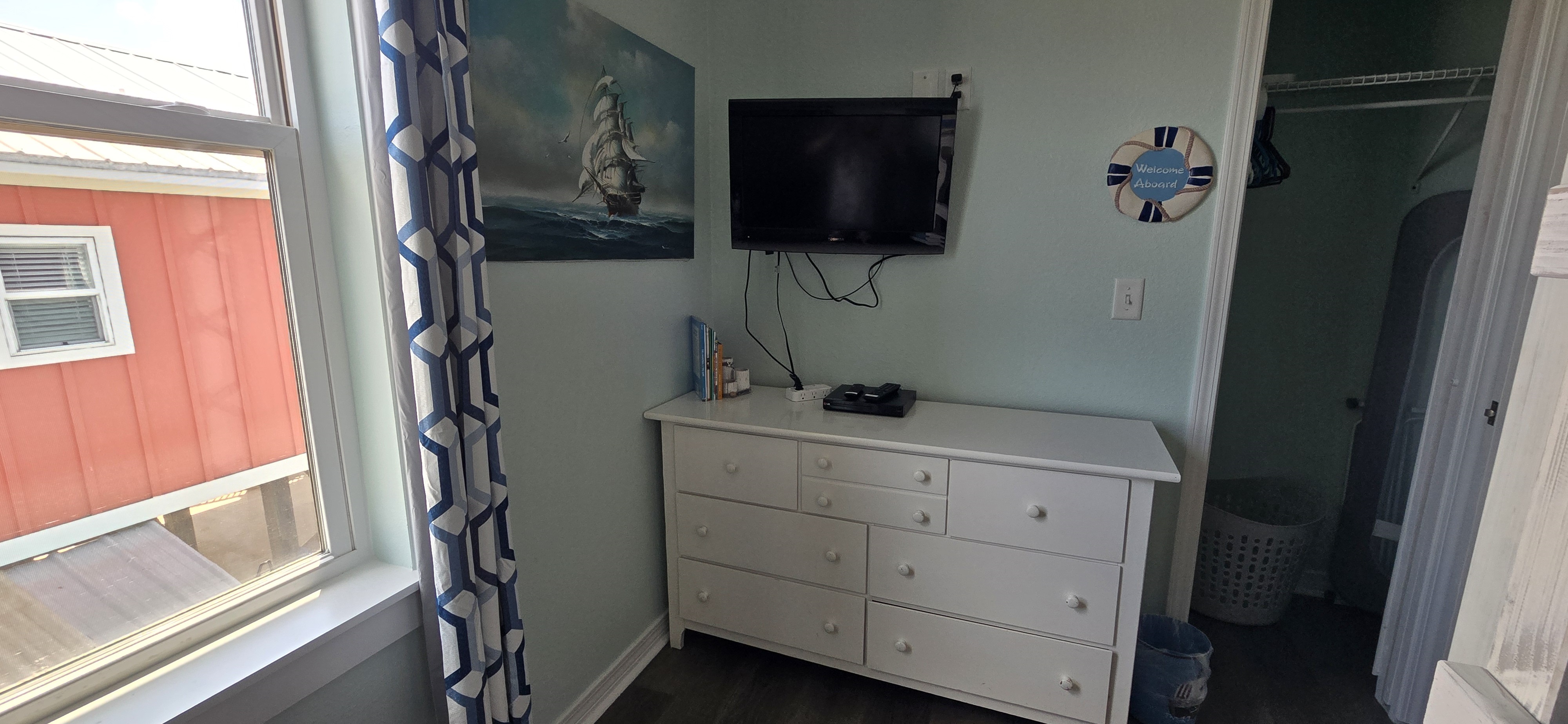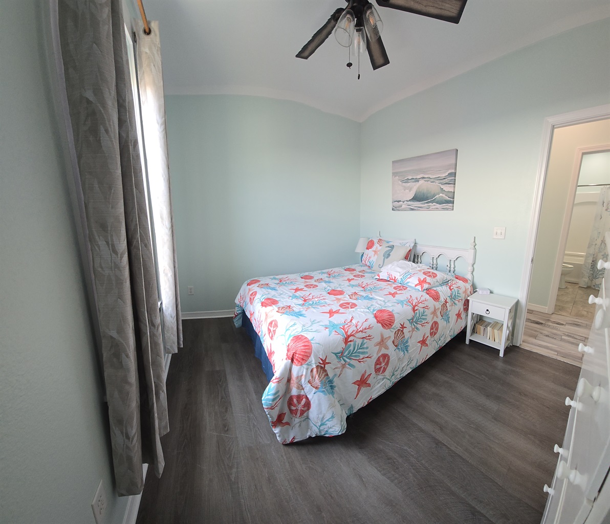 The home features 3 bedrooms, including a king-size bed in the master, a queen bed in the guest room, and bunk beds and a twin bed with trundle in the kids' room. The living room has a queen and twin sleeper sofa. Featuring a fully equipped kitchen, Wi-Fi, and TVs in all rooms provide all the comforts of home. The covered front and back porches offer additional relaxation spaces, and the carpetless interior adds to the clean, comfortable atmosphere.